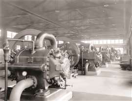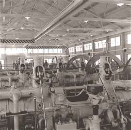 Inside view of the Hope Natural Gas Hubbell Station compressor building with four Westinghouse and two Cooper horizontal engine compressors visible, 1939.