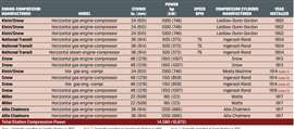 A c.1923 journal, neatly hand-printed in blue ink, documented the equipment and brief histories of most of the Ohio Fuel Gas pipeline compressor stations. The stations ranged from very small to very large. The oldest, Wheeler Compressor Station, was erected in 1901-1902 in northwest Ohio by the Northwestern Natural Gas Company with three 1000 hp (746 kW) Klein/Snow horizontal gas engine-compressors to supply the cities of Toledo and Cleveland. In 1904, three 500 hp (373 kW) National Transit horizontal steam engine-compressors were added. In 1912-1913, the station was again expanded and two 1350 hp (1007 kW) Snow horizontal gas engine-compressors were installed. In 1914, two stations were purchased from the Columbia Gas and Fuel Company and, with another expansion of the Wheeler engine house, the horizontal gas engine-compressors from the two Columbia stations were moved and installed at Wheeler, including a 1000 hp (746 kW) Klein/Snow and two 1150 hp (858 kW) Snows. With yet another expansion in 1916, an additional 1350 (1007 kW) Snow horizontal was transferred from Treat Station. In 1917, two new 165 hp (123 kW) Miller horizontal engine-compressors were added. Finally, in 1917, two 1200 hp (895 kW) Allis-Chalmers horizontals were added, bringing the station to 14,580 hp (10,872 kW) of compression. Table 1 is a complete list of the major engine-compressors at the Wheeler Station.