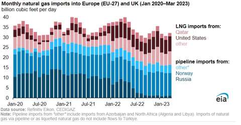 Europe and the UK typically rely on natural gas imports to meet more than 80% of natural gas consumption. Russia’s natural gas exports to Europe, which had averaged 8.8 billion cubic feet per day (Bcf/d) during winter 2021–22, declined by 87%, averaging 1.1 Bcf/d this past winter. Although natural gas imports by pipeline from Norway increased to 11.3 Bcf/d in 2022 (3% more than in 2021) and averaged 11.5 Bcf/d during the winter, a significant increase in LNG imports helped to refill storage inventories and balance the market, offsetting the decline in pipeline imports from Russia.