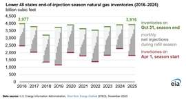 Underground storage remains the key balancing mechanism for gas markets during periods of peak demand, particularly in winter. At the start of the 2025–26 heating season, Lower 48 storage sites were 92% full, even after capacity was expanded last year. Each major storage region was at least 86% full as of October 31.