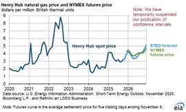 The EIA expects Henry Hub spot prices to rise to an average of $3.90/MMBtu this winter (November–March), following typical seasonal patterns of higher heating demand. Prices are then forecast to hold near $4.00/MMBtu in 2026 as U.S. LNG exports continue to grow and domestic production levels off.