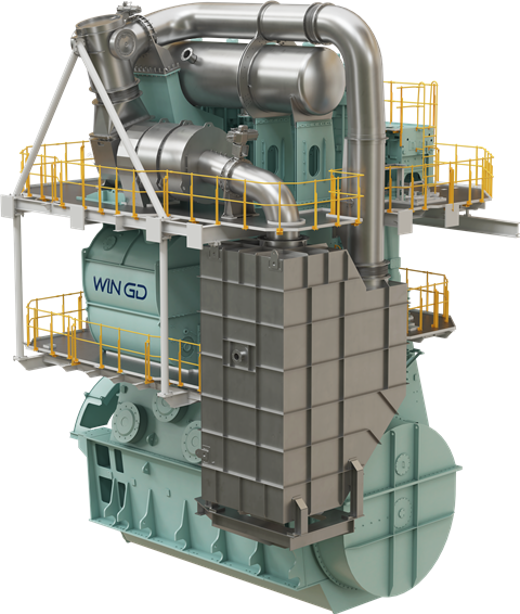 Swiss marine power company WinGD has introduced an on-engine version of its iCER system, enabling the emissions reduction technology to be installed without impact on engine footprint. (Image: WinGD)